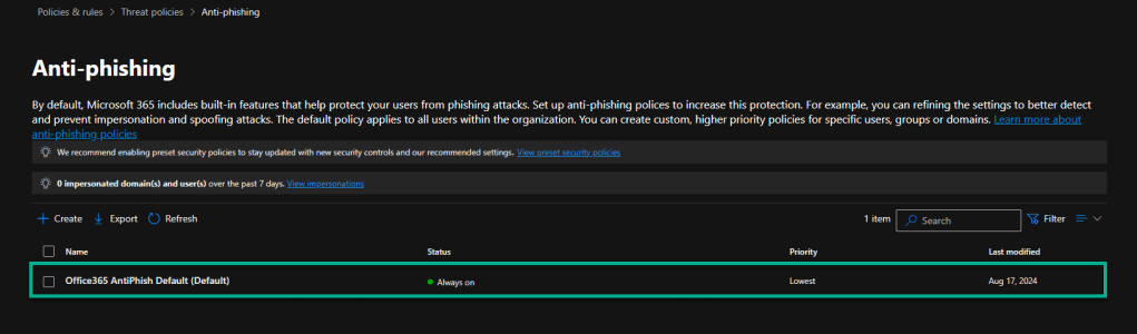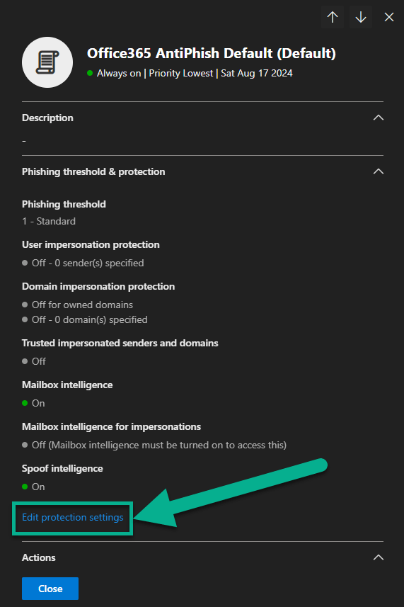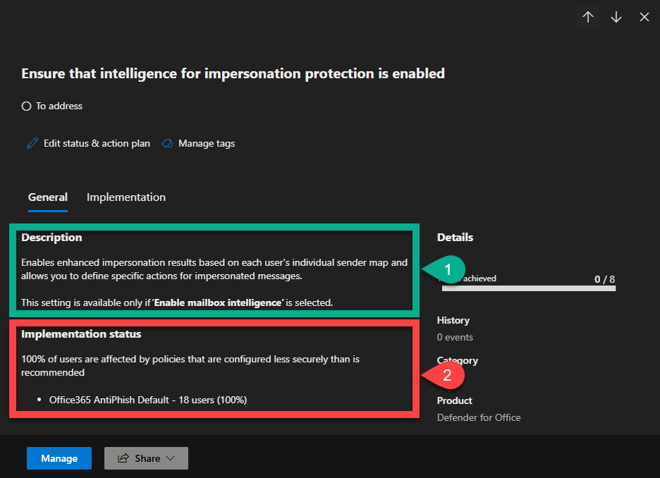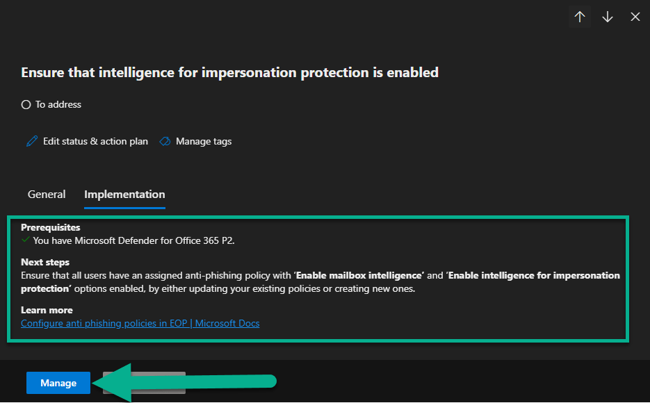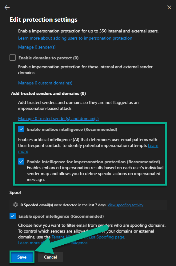 Aqui vou usar a primeira opção recomendada, “Ensure that intelligence for impersonation protection is enabled”.