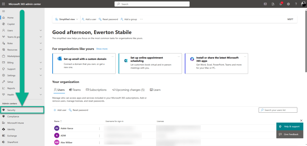 Aqui vou mostrar um passo a passo básico, no “Microsoft 365 Admin Center” na coluna da esquerda vá em “Security”.