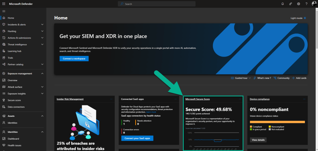 Na sequência será aberto o portal do Microsoft Defender, vá em Microsoft Secure Score.